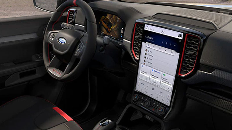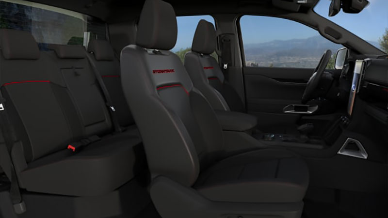 Nội thất Ranger Stormtrak mang thiết kế đặc trưng với tông màu đen kết hợp với đường chỉ đỏ tương phản, đặc biệt ghế da được thêu chữ “Stormtrak” màu đỏ cùng những công nghệ hiện đại trang bị trên xe giúp đáp ứng mọi nhu cầu của người lái.