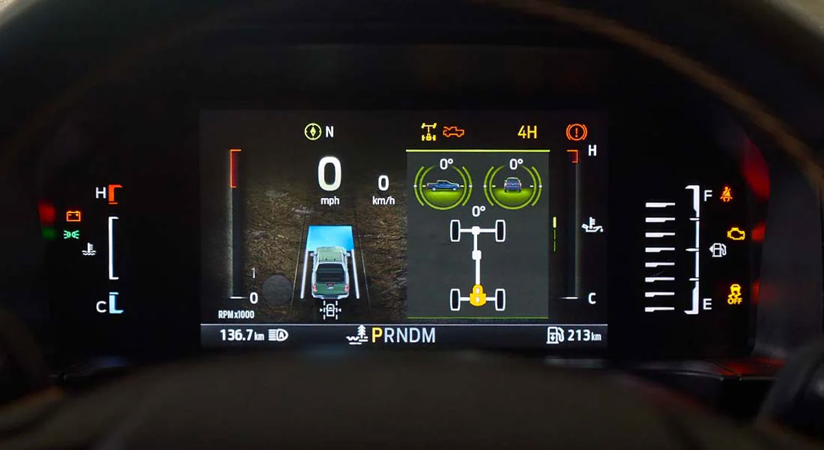 Màn hình dành riêng cho chế độ off-road cung cấp tính năng chia màn hình để hiển thị đồng thời hình ảnh từ camera phía trước, kết hợp cùng màn hình kỹ thuật số hiển thị độ nghiêng và dốc của xe. Người lái có thể thao tác kích hoạt các chế độ off-road khác nhau trên màn hình, bao gồm hệ thống kiểm soát đổ đèo và khóa vi sai.