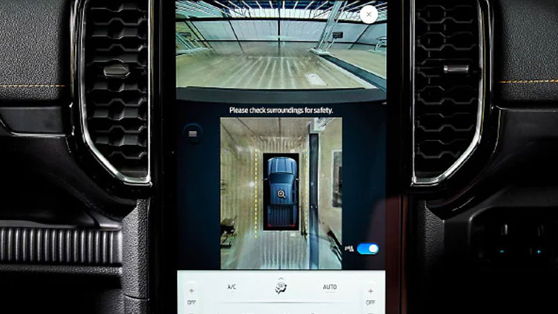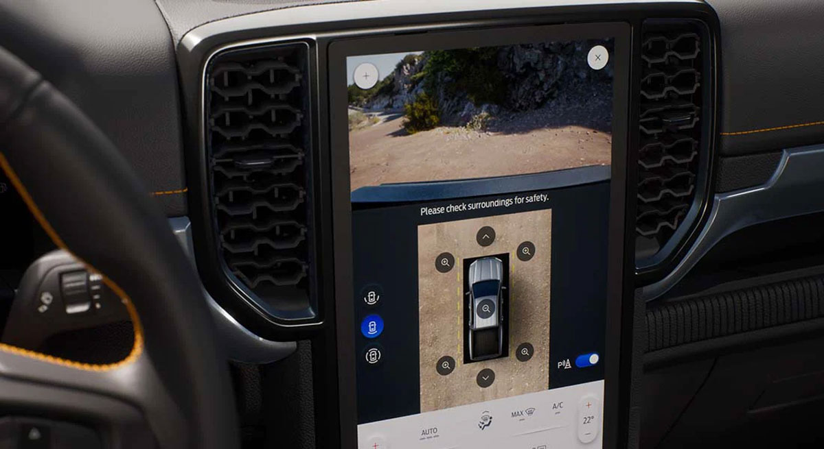 Bạn có thể quan sát toàn cảnh chiếc xe 360 từ trên xuống. Rangertổng hợp tất cả thông tin từ tất cả các camera và hiển thị lên màn hình trung tâm lớn cho bạn vào bãi đỗ xe hay lái qua những đoạn đường hẹp dễ dàng và an toàn hơn.