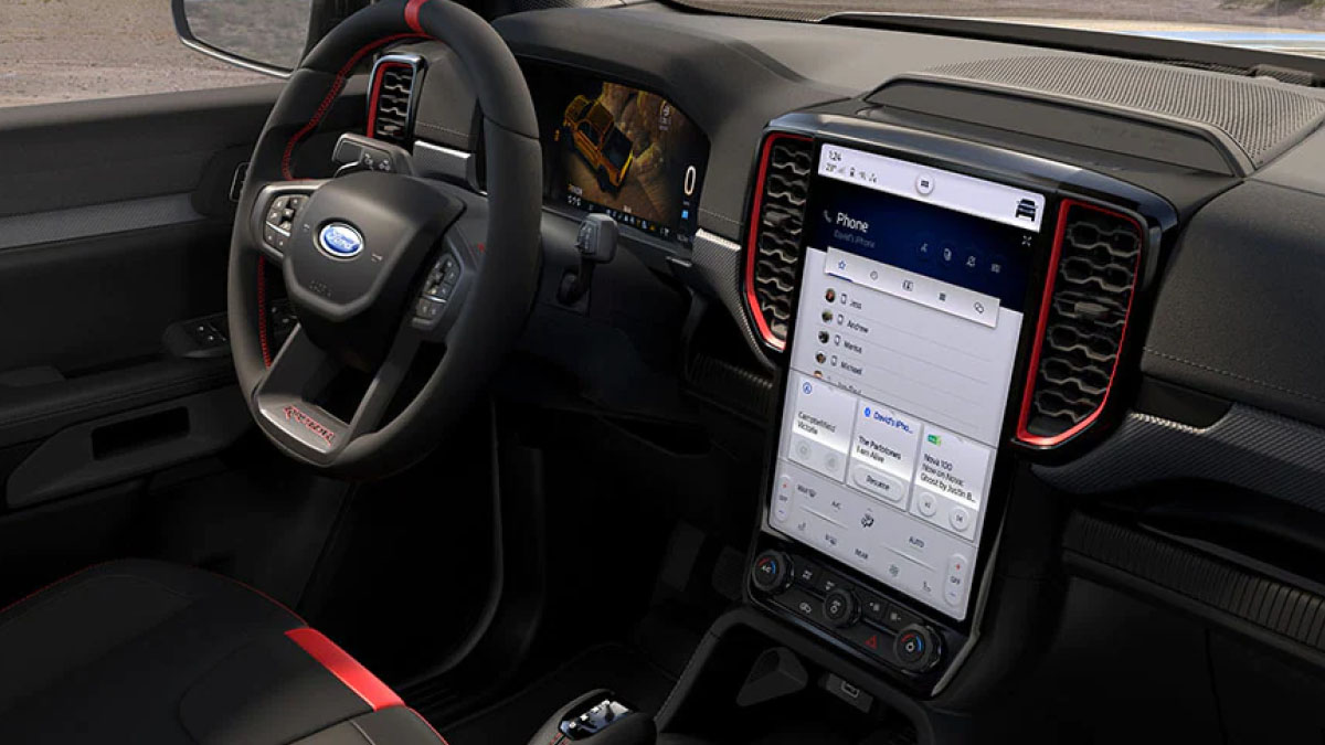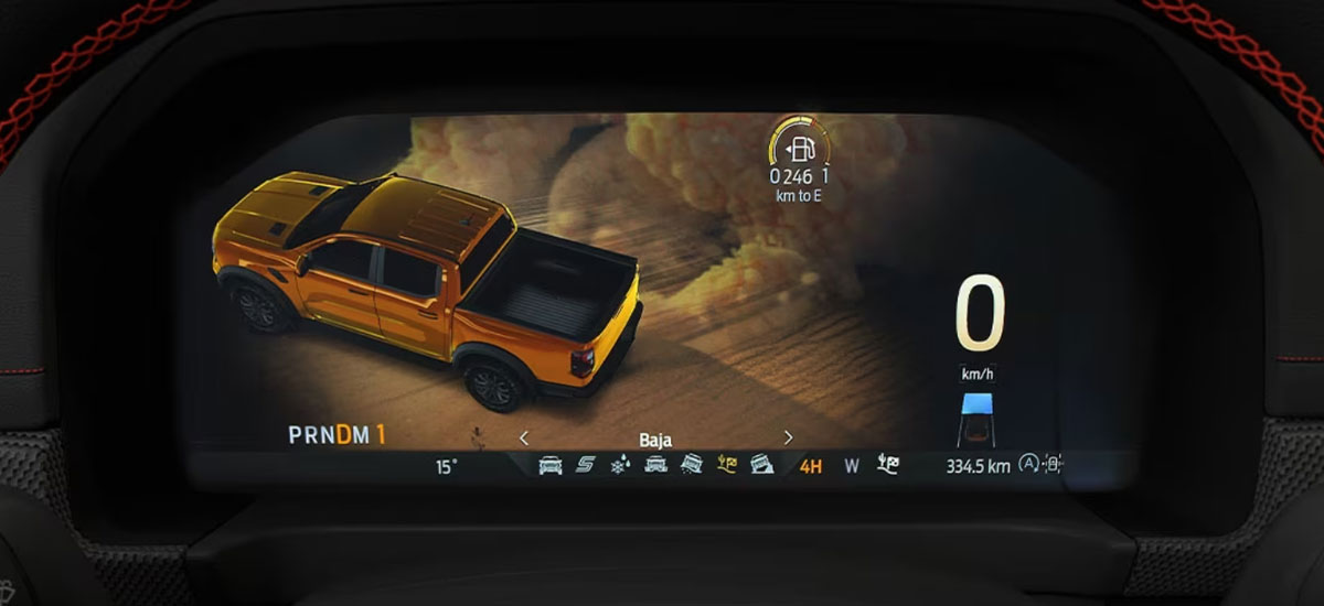 Cụm đồng hồ kỹ thuật số 12,4 inch của Ranger Raptor với màn hình màu có độ phân giải cao và có thể tùy chỉnh. Màn hình giải trí cảm ứng trung tâm 12 inch cỡ lớn của Ranger Raptor được trang bị hệ thống thông tin giải trí SYNC® 4A mới nhất của Ford, hỗ trợ kết nối Apple CarPlay và Android Auto, có thể phát trực tuyến bản nhạc yêu thích của bạn thông qua hệ thống âm thanh sống động. Từ màn hình trung tâm lớn, bạn có thể chọn nhiều chế độ quan sát camera để mở rộng tầm nhìn hơn bao giờ hết.